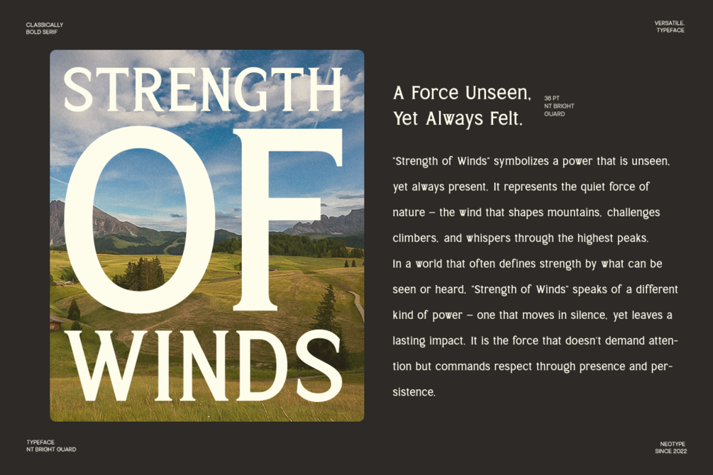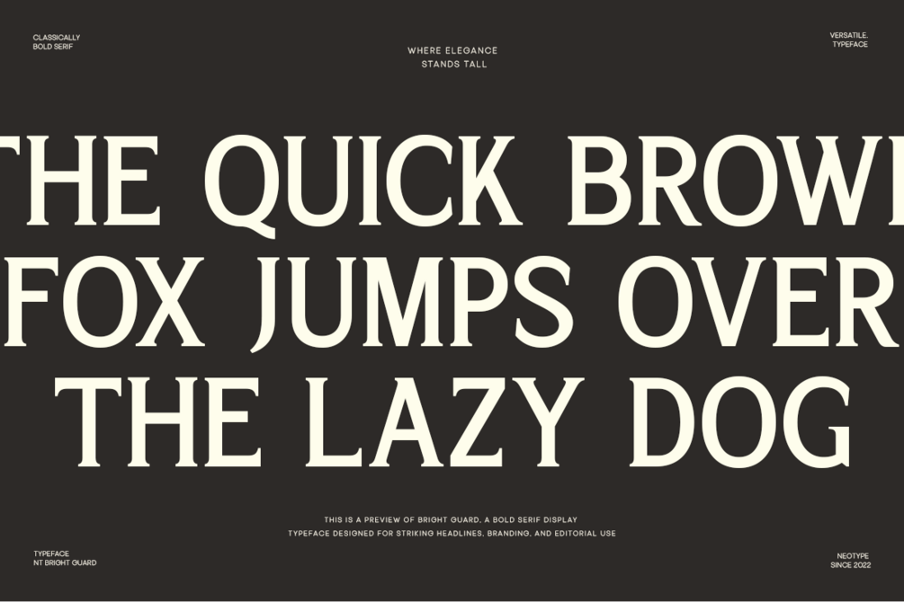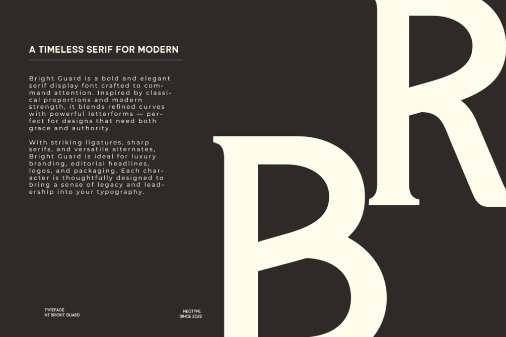 Bright Guard is a bold and elegant serif display font crafted to command attention. Inspired by classical proportions and modern strength, it blends refined curves with powerful letterforms — perfect for designs that need both grace and authority.