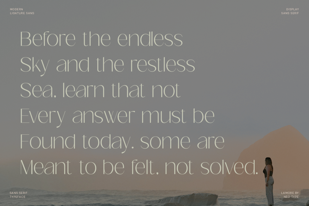 Lamore is a minimalist clean sans serif display font introduced as a modern alternative to Radiant. Designed by Neotype, Lamore offers refined geometry, smooth curves, and strong visual clarity—making it perfect for designers looking for a cleaner, more contemporary option with the same bold presence. Ideal for branding, logos, editorial layouts, and any project that needs a fresh and stylish display typeface.