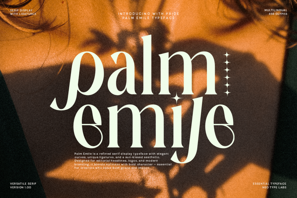 Palm Emile is a refined serif display typeface that blends classic sophistication with modern charm. Featuring elegant curves, unique ligatures, and a sun-kissed aesthetic, Palm Emile is designed to bring warmth and personality to your visual projects.